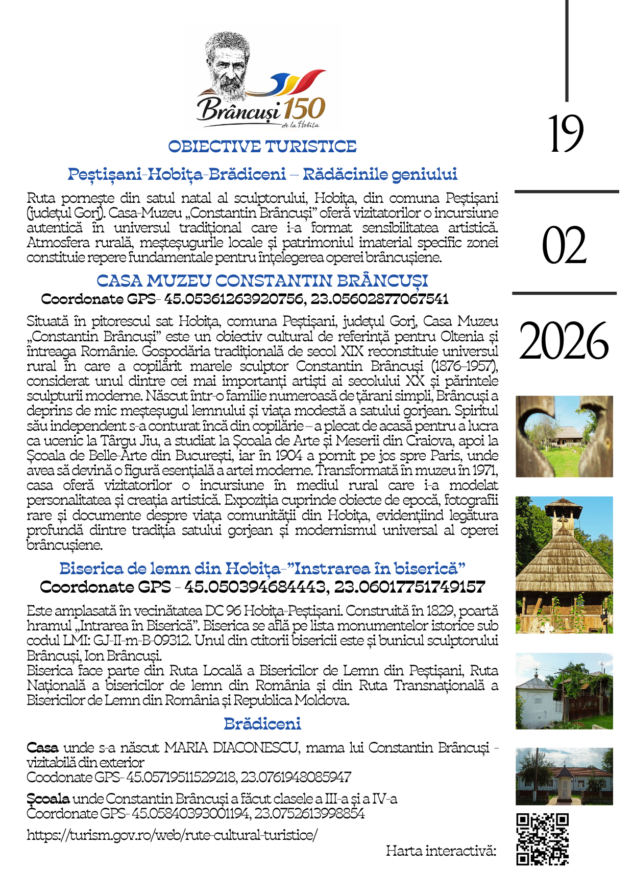 Casa Muzeu Constantin Brâncuși – Biserica de lemn din Hobița – Brădiceni – locul unde s-a născut MARIA DIACONESCU, mama lui Constantin Brâncuși – Brădiceni-școala unde Constantin Brâncuși a făcut clasele a III-a și a IV-a