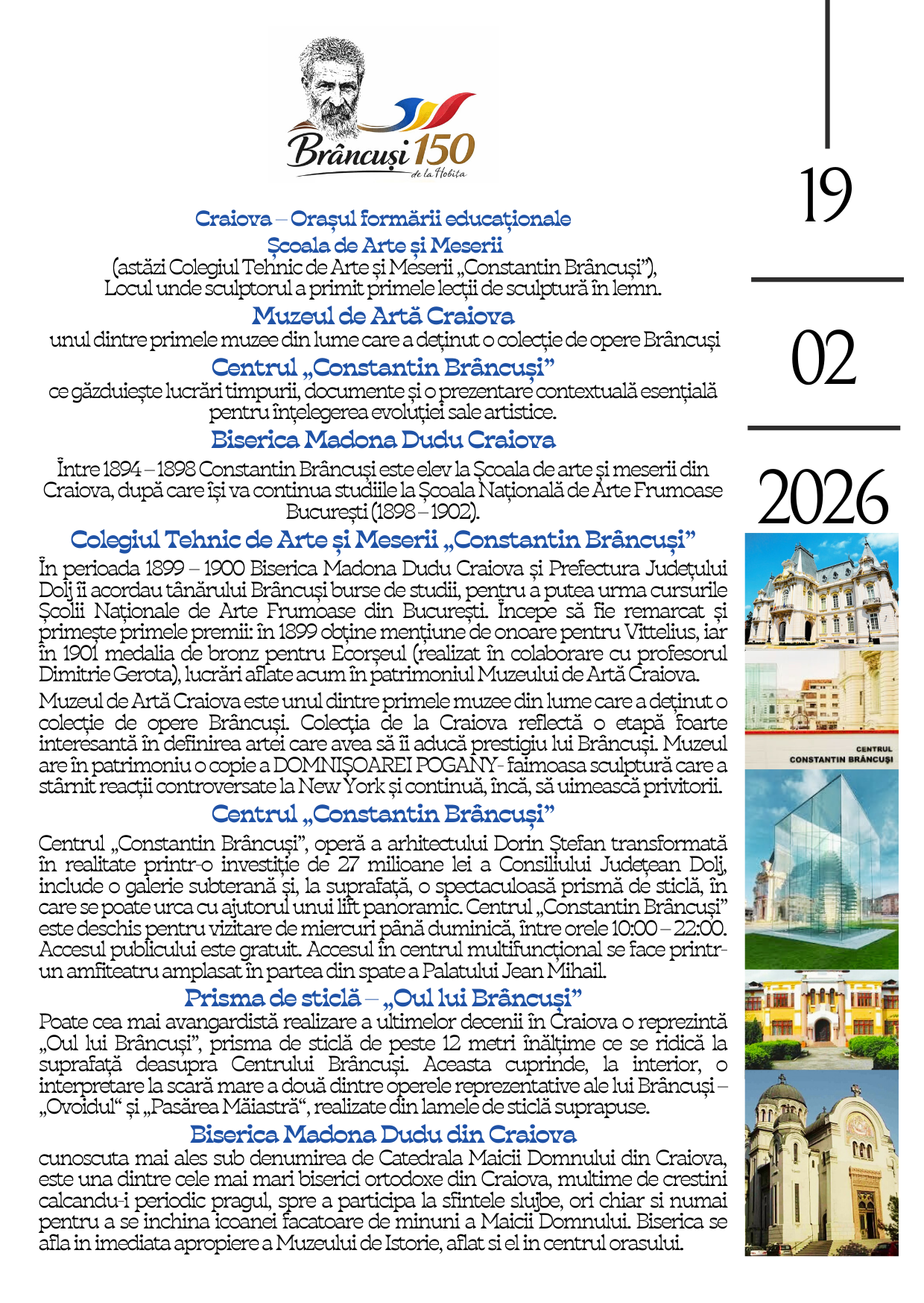Locuri legate de formarea sa: Școala de Arte și Meserii (astăzi Colegiul Tehnic de Arte și Meserii „Constantin Brâncuși”, Str. Constantin Brâncuși 17) -Muzeul de Artă+Centrul Brâncuși+Biserica Madona Dudu